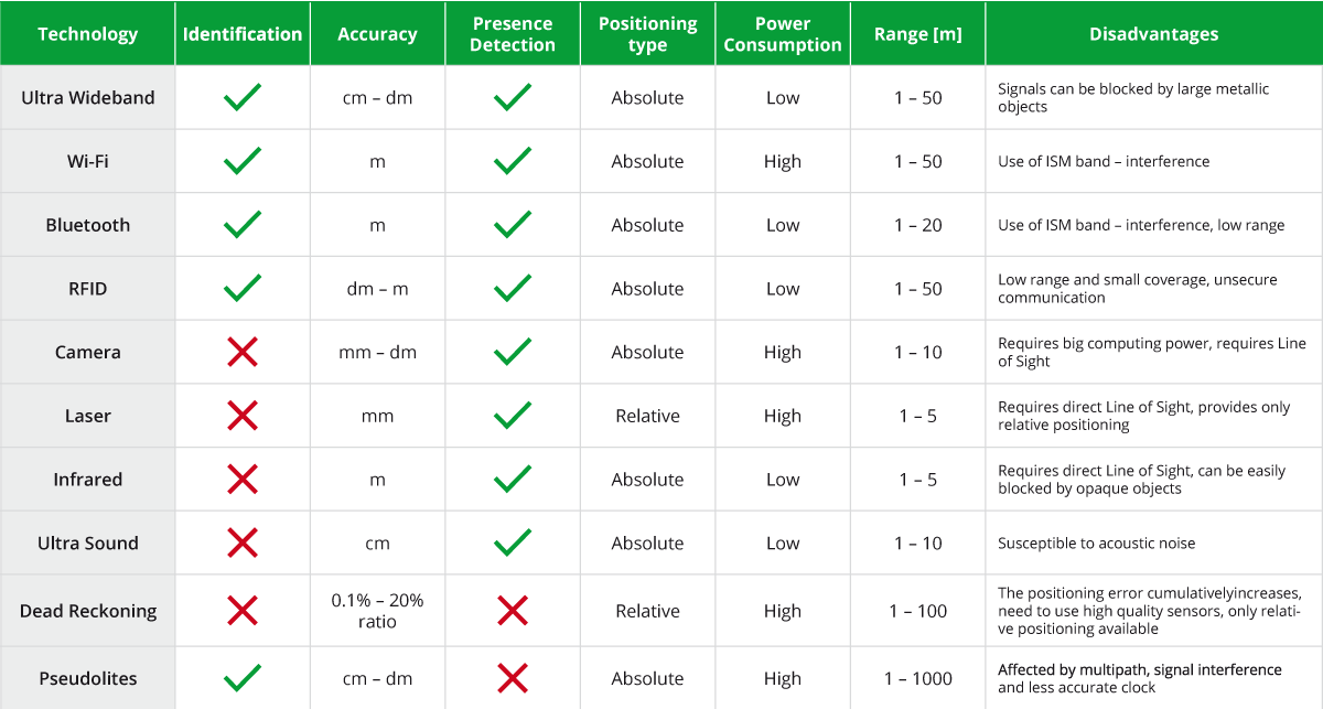 เทคโนโลยี RTLS นั้นได้ถูกนำมาใช้งานในเชิงพานิชย์มากขึ้น โดยอาศัยช่วงคลื่นความถี่วิทยุที่ถูกกำหนดให้สามารถใช้งานได้ในแต่ละประเทศ และแบ่งลักษณะของเทคโนโลยีที่สามารถใช้งานในอาคารและภายนอกอาคารได้ โดยประเทศไทยสามารถแบ่งแยกเทคโนโลยี RTLS ออกตามกลุ่มคลื่นความถี่ตั้งแต่ 900Mhz, 2.4GHz และ 5GHz โดยเทคโนโลยีที่นำคลื่นความถี่เหล่านี้ออกมาใช้จะประกอบด้วย RFID, BLE, UWB, Microwave, Wi-Fi, GPS ซึ่งแต่ละเทคโนโลยีจะมีลักษณะเด่นที่แตกต่างกัน สามารถดูความสามารถของแต่ละเทคโนโลยีได้ตามตารางด้านล่างนี้